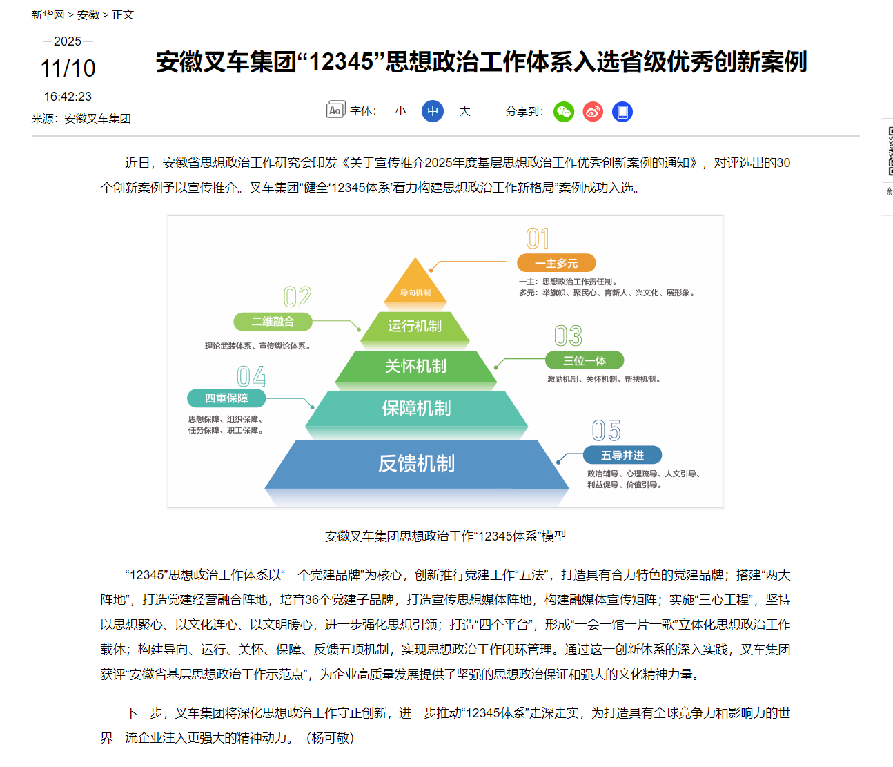 【新华网】安徽叉车集团“12345”思想政治工作体系入选省级优秀创新案例